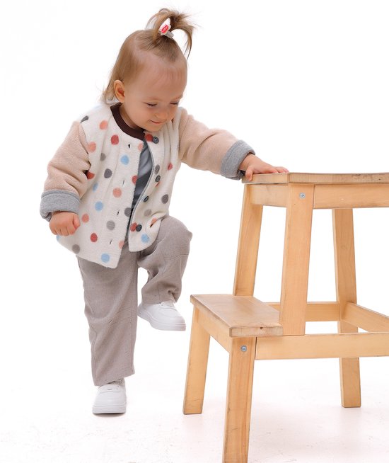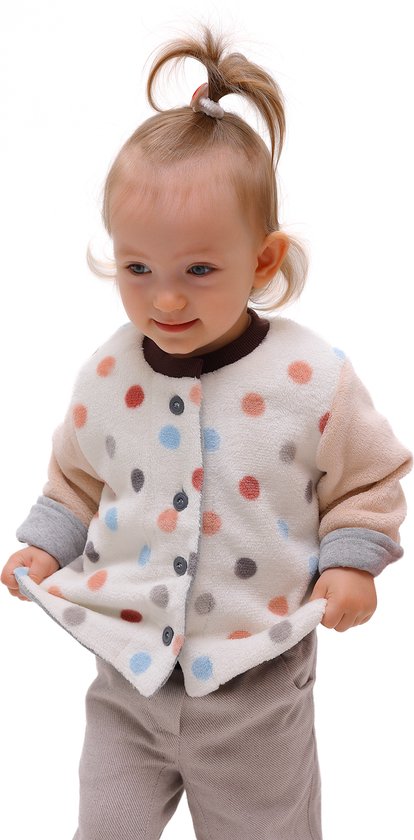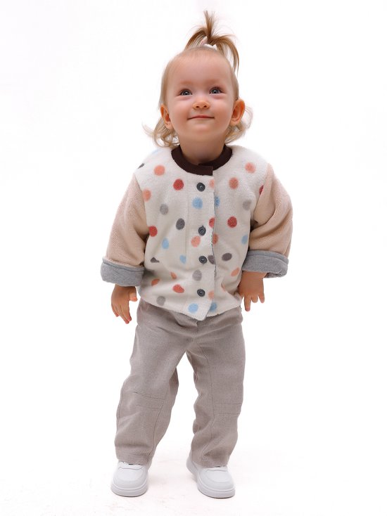 Het model op de foto is 82 cm lang en draagt maat 80-86.